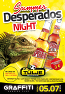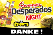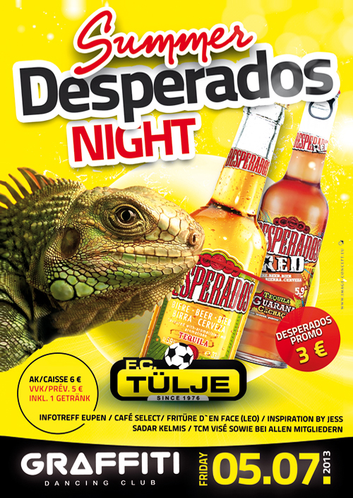 Vorverkauf für die Summer-Desperados-Night gestartet! Nach den Erfolgen in den letzten Jahren, wird der FC Tülje auch in diesem Jahr im Juli wieder eine Sommerparty organisieren, diesmal erneut im Zeichen des Tequila-Bieres Desperados. Die Vorverkaufskarten für dieses Graffiti-Event kosten 5 Euro (inklusive Freigetränk) und sind im Infotreff Eupen, Café Select, Fritüre d'en face (Leo), Inspiration by Jess, Sadar Kelmis, TCM Visé sowie bei allen Mitgliedern des FC Tülje erhältlich. Der Preis an der Abendkasse beträgt 6 Euro. Karten kann man aber auch online anfordern unter tuelje@yahoo.de Wir bedanken uns schon jetzt im Voraus bei allen Gästen und wünschen euch viel Spaß auf unserer Party. |